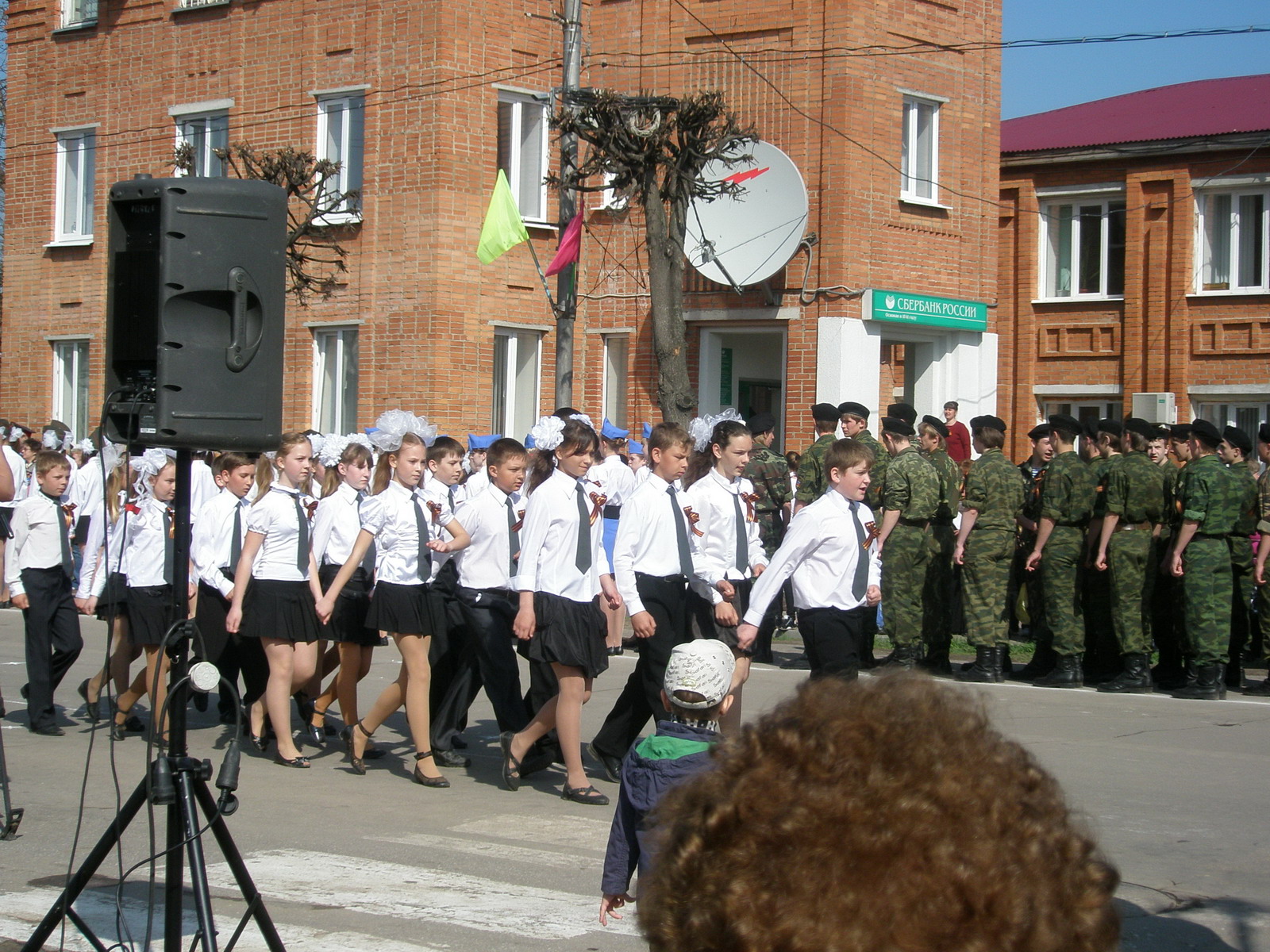 Выпив чашку ароматного кофе со свежеиспеченными блинами на деревенском молоке, отправились мы в тот самый город Шилово за парным мясом на шашлыки...Не ожидали попасть на парад, а попали! Вернее сказать, это не парад то и был, а традиционные для этого города - показательные выступления школьных коллективов по хождению строем и строевой песне. От больших до самых маленьких - школьники демонстрировали выправку и тянули носок при хотьбе. :wink:
