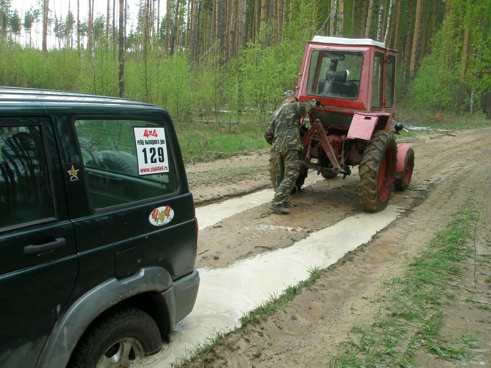 Спасла нас мама штурмана! Вот ведь есть женщины в русских селеньях! Нет. Она не вытащила Патриот из лужи, но один звонок ей и через пять минут рядом с моей машиной стоял трактор!