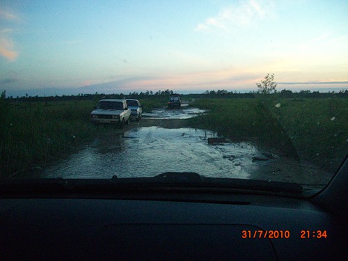 Понял, что шноркеля может не хватить, и не поехал. Зато в обратный путь все поехали короткой дорогой. Сначала было довольно хорошо, потом пошли торфяные болота и хорошая колея в них. Прочитали, что, оказывается, едим по тракторному зимнику. В результате долгих размышлений было принято правильное для маленькой машинки решение - развернуться.