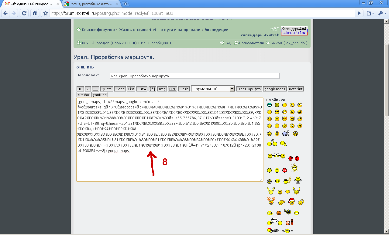 Теперь в редакторе сообщения на форуме вы можете кликнуть по кнопке "googlemaps" (6) и в тексте сообщения возникнет код вставки карты (7). Курсор будет находится посередине.