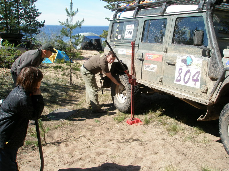 На второй день у нас развалилась задняя тага-панара! Спасибо, Хатхи, Кимычу и Борису на Блейзере, что нашли в ближайшей деревне замечательного дядю Сашу, который за 3 банки пива и 500р. сварил нам нашу тягу. Пришлось, конечно, пожертвовать монтировкой...Её обрезали и вставили в тягу для усиления. Эта тяга прошла всю Ладогу! Спасибо, дяде Саше!