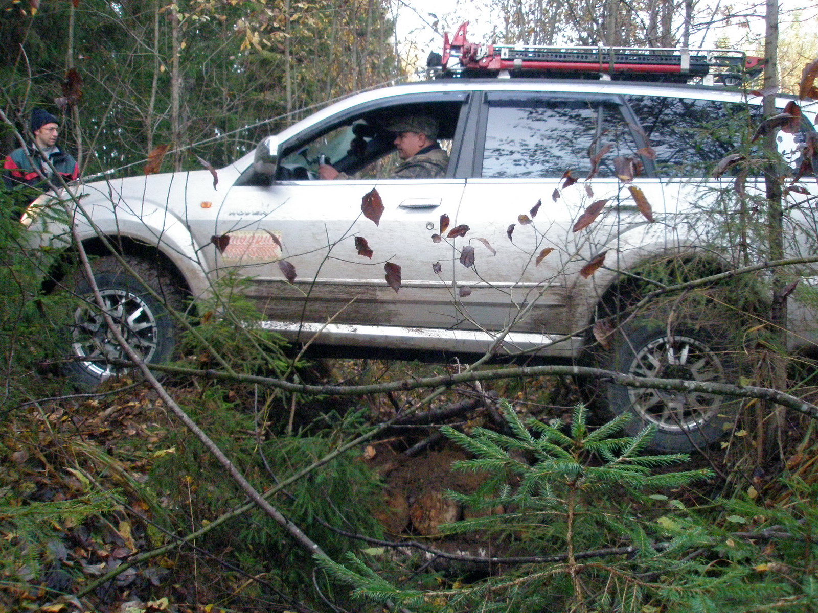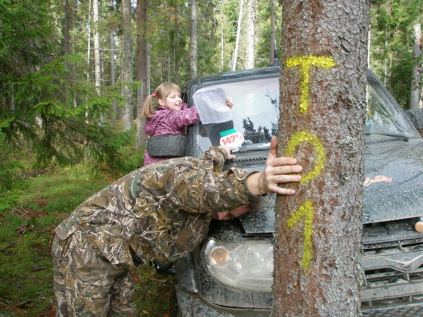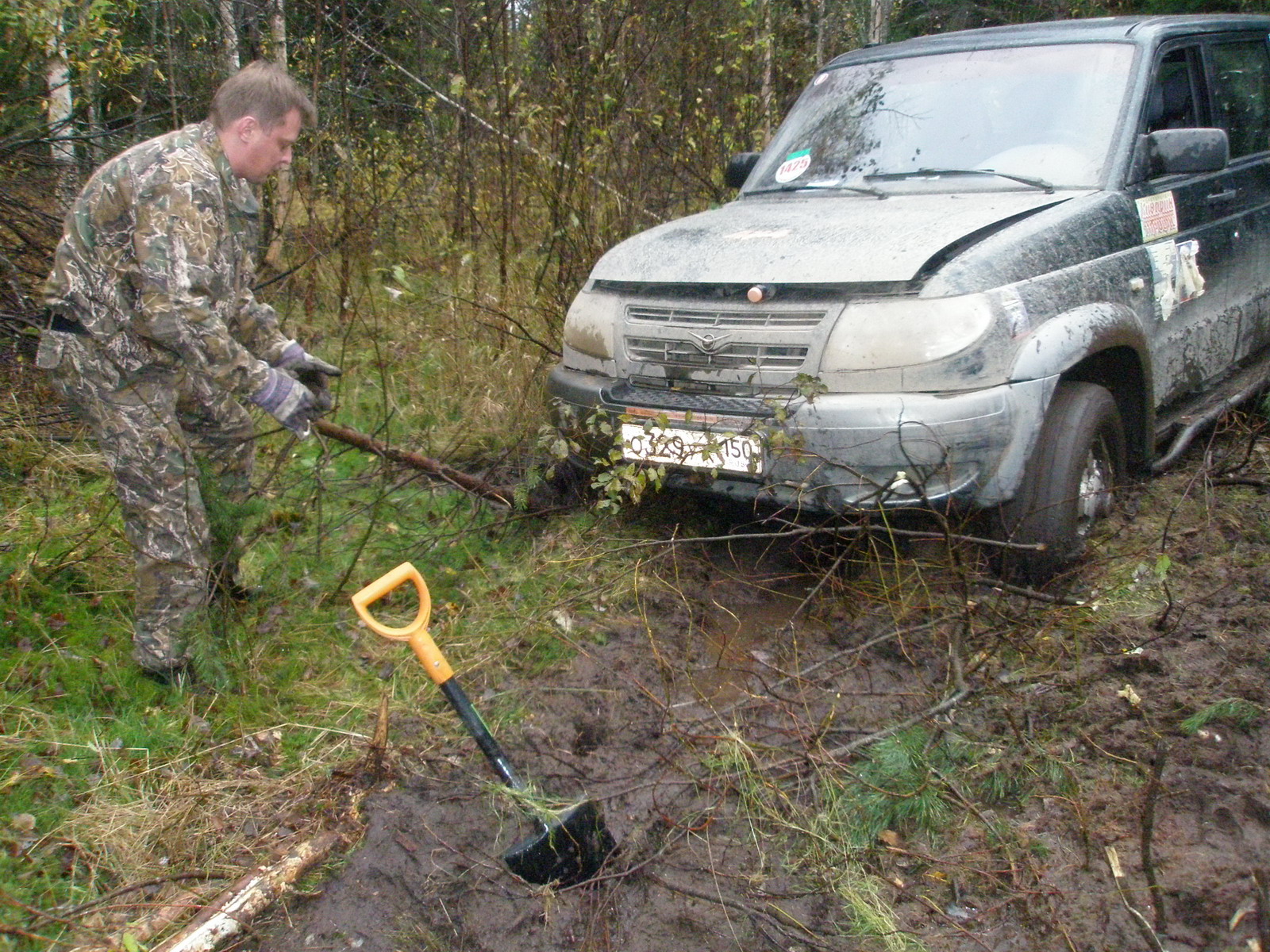 Разчудесные дорожки приводили нас, то преодолевать болотину, размешанную зубастыми колёсами других участников, а то и пробираться сквозь пеньки и валежник к точкам спецучастков… Пилот справлялся с манёврами меж пеньков просто на 5 с +!!! Я и младший штурман старались во все глаза разглядеть наличие препятствий на пути Патриота. Не всегда, правда, удавалось выбрать правильную траекторию…Вот так на одном из участков, практически, с разбега машина застряла напрочь! Спасателями оказались: лопата, бензопила и наши шесть рук :wave: Уж, очень не хотелось спать в болоте, а потому просто обязаны были вылезти! И вылезли!