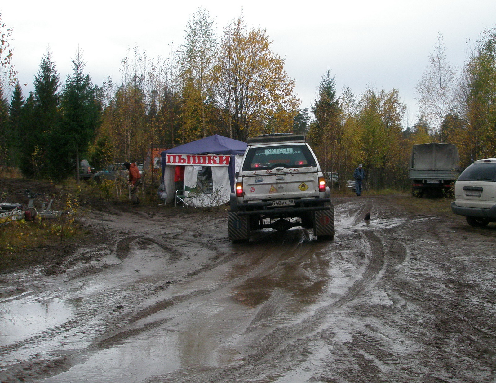За приготовлениями пролетел вечер, наступила ночь, а наш экипаж спать ещё не ложился. Утром пасмурная погода сопроводила до лагеря, и лишь на время «раздобрела» солнышком. Этого как раз хватило, чтобы наклеить наклейки и полакомиться свежеиспеченными пышками (по-московски – пончиками). Кстати, эта чудная палатка «Пышки» со свежей выпечкой и горячим чаем оказалась очень вовремя! Ух, и вкусные были «бублики»! Когда подкрепишься, тогда и преграды ни почём!