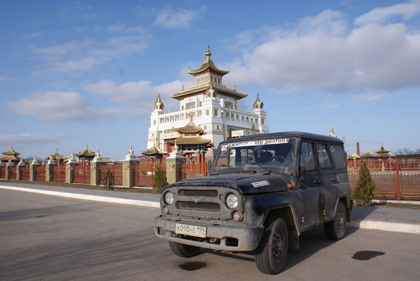 Приключения начались с первых километров и не оставляли нас всю дорогу. Не доехав и до Каширы, у нас случилась беда с гидроусилителем. Пришлось вернуться. Но "Русские не сдаются"! Заменив необходимое, мы тронулись в путь. До Тихорецка (Ставропольский край) дошли без приключений. А там наш ремень гидрача лишился пары ручейков. Пришлось останавливаться там на ночь, а утром искать новый ремень. (Хотя именно на этом драном ремне мы в Москву и приехали.) Посетив Кисловодск, напившись минеральной воды, полезли мы в горы. В первый день удалось нам освоить дорогу от Кисловодска до Карачаевска. Поднялись мы на 2240 м. Красотища офигенная!!! На второй день мы попытались освоить новую дорогу через горный хребет от Кисловодска на Эльбрус. Не получилось! Во-первых, на высоте свыше 2700 м снега нашему горному козлику по самые рожки, во-вторых, на самой вершине при резком подъеме у нас рванул радиатор. Но и тут нам повезло. Наткнулись на местных строителей, которые не только залепили нам радиатор холодной сваркой, но и накормили и напоили нас. Кавказское гостеприимство, однако! :occasion14: За что им низкий поклон. Накатавшись по горам, мы приняли решение вернуться через Калмыкию. Дабы там тоже есть что посмотреть.