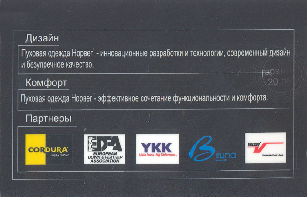 Стежка пухового пакета выполнена с использованием «теплых швов», т.е. стежка не сквозная, а при помощи специальных лент. Этот способ обработки создает дополнительную воздушную прослойку внутри куртки, и, как следствие, дополнительную теплозащиту. Кроме того, такой вид обработки предотвращает «вылезание» пуха.