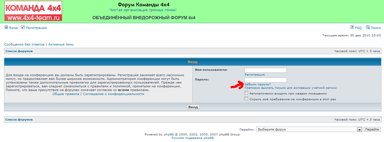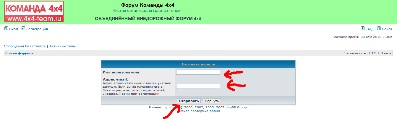 Итак, если у вас была учетная запись на старом форуме Команды 4x4, то, скорее всего, вы уже получили письмо со ссылкой на новый форум с указанием вашего имени и пароля. Если же но получали - не отчаивайтесь, вам необходимо использовать именно тем имена, которые были у вас ранее зарегистрированы на старом форуме Команды 4x4. Так как эти имена (вместе с адресами электронной почты, и эту пару вам необходимо знать, чтобы вновь получить доступ к форуму) были перенесены в общую базу пользователей Объединенного форума, зарегистрироваться вновь с этим же именем не получится - оно уже существует. Но вот пароль вам придется создавать заново, вот таким образом.