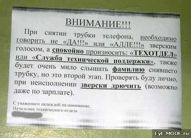 Супер!!! Мне однажды, ответили: "Ща, банан доем и скажу, что делать". Я готова была задушить этого сотрудника через трубку, потому что около часа там никто не брал трубку. :evil: