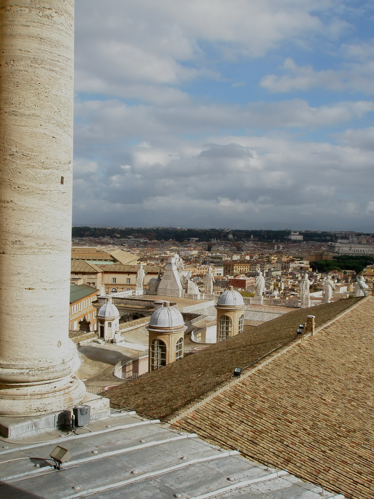 Куда интереснее Собор Святого Петра. Какие мощные колонны! Какая высота купола! Какие крупные скульптуры! Залезть на купол Собора - было одной из моих главных задач при посещении Рима. Исаакиевский Собор в Питере – уменьшенная копия Собора Петра. Оно и понятно – Питер строили итальянцы. Думаю, если бы решилась подниматься на купол по лестнице, пришла бы туда на второй день. Лифт значительно сократил путь и сохранил силы. Избежать лестничного подъёма всё же не вышло. Лифт только до пол пути. В путеводителе написано, что на купол ведет 551 ступенька. Через пять минут перестаёшь считать ступеньки…лестница то вверх, то вправо, то влево, то по кругу…А когда стены начинают идти под уклоном, кажется, что это уже что-то с головой и это просто зрический обман…Как известно, последний бой – он трудный самый. Так вот последний этап подъёма – винтовая вертикальная лестница средь стен, где помешается 1 очень неполный человек. Преодолевая весь путь наверх, ловила себя на мысли: «Хоть бы никто из возвращающихся не попался на встречу» Так никто и не попался! Оказалось, что всё предусмотрено! Поднимаешься по одному пути, а спускаешься - по другому, но при этом выходишь там же, где зашёл. Чудеса архитектурные! С купола, конечно открывается вид хоть не на весь Рим, но на довольно большую его часть.