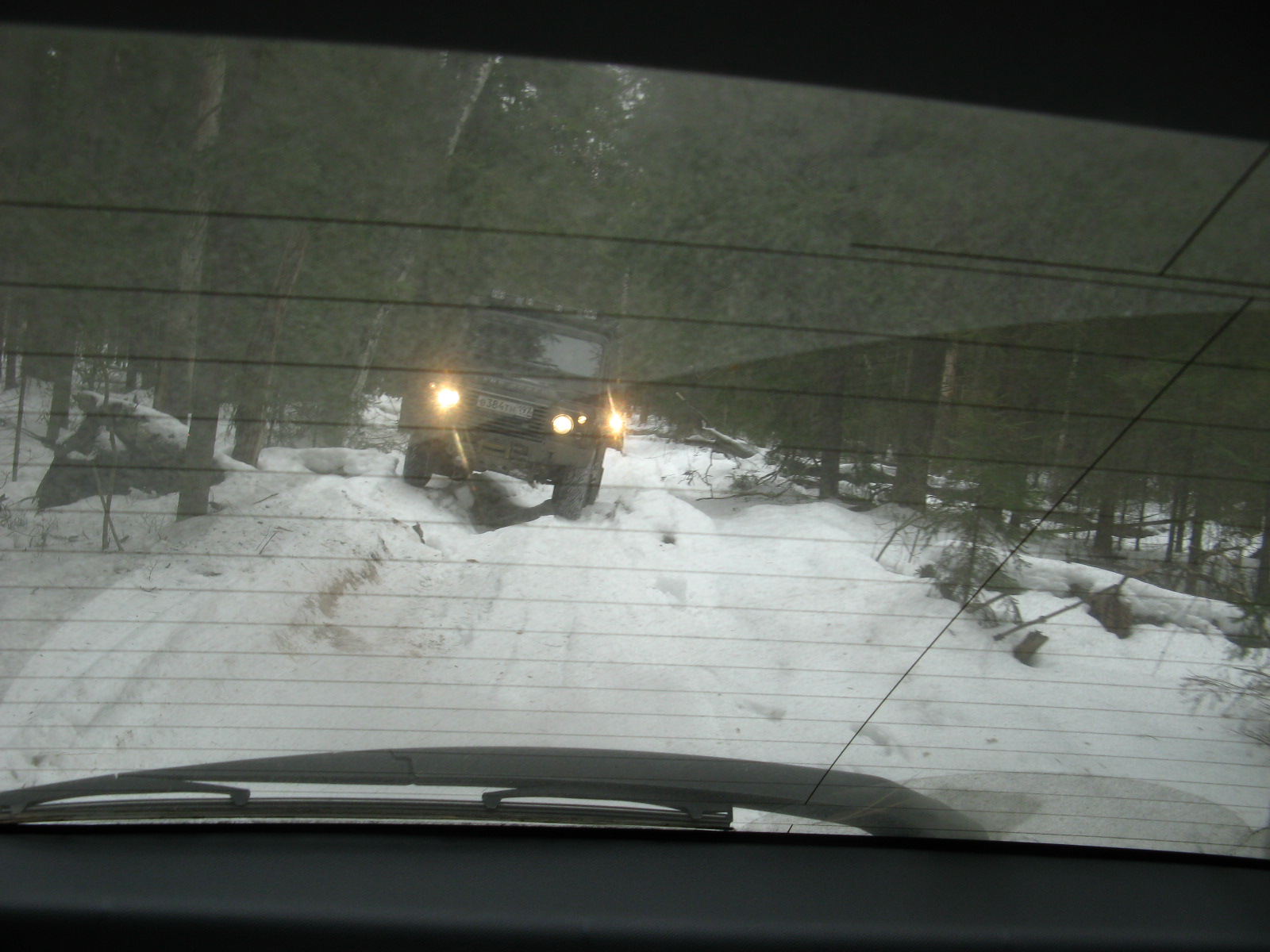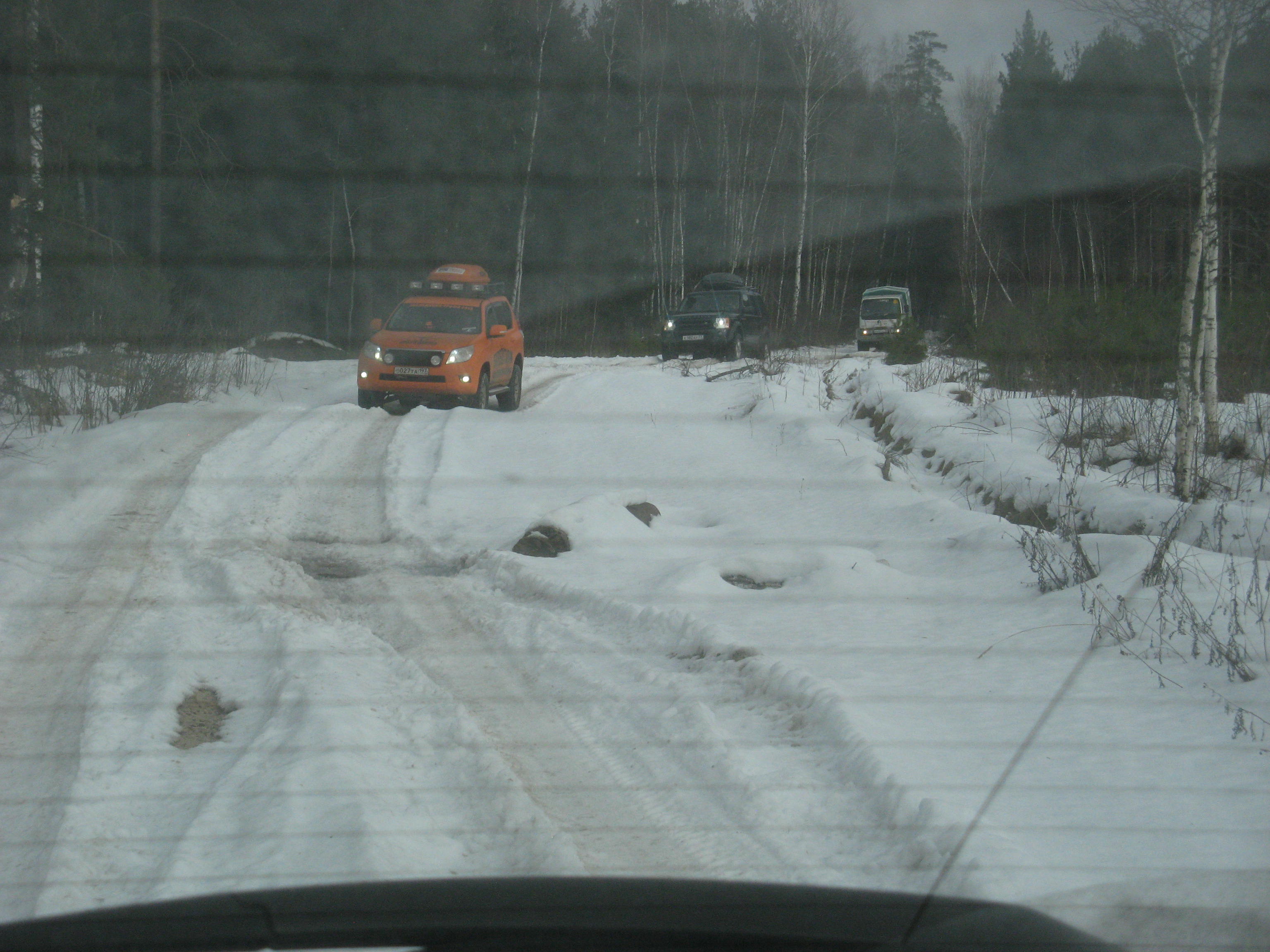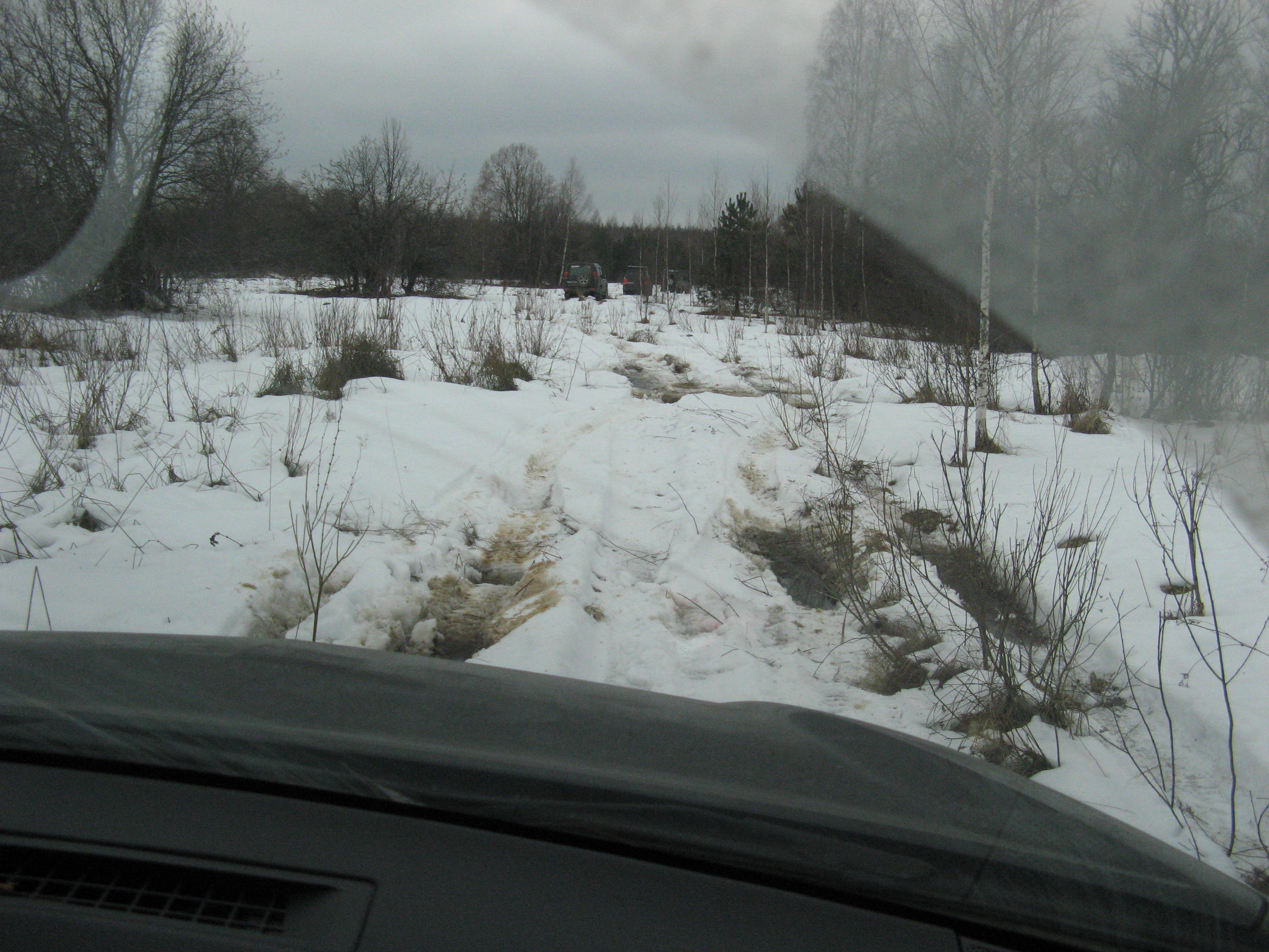 Отлично покатались! Погода, правда, превратила почти все в "асфальт", но true джипер грязь найдет. Вот мы ее и нашли на подъездах к озеру. На трассе сильных было несколько ручьев, но то ли погода такая была, то ли страха по неопытности не было, но подсесть на них не получилось. Некоторые из нас стали нарочно искать приключений на свою голову и намеренно пытались засадить машинки. И это у двоих из них получилось. А еще у одного не получилось - но вместо этого получилось погнуть диск и железо в подвеске :nBangHead: