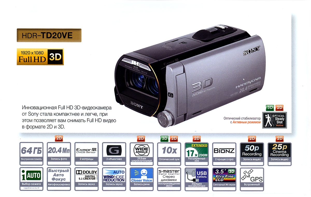 Оптический стабилизатор Optical SteadyShot с улучшенным активным режимом - 3-направленный анти-шок для стабильного изображения, даже при съемке во время прогулки. Теперь идеальная стабилизация доступна во всем диапазоне зумирования