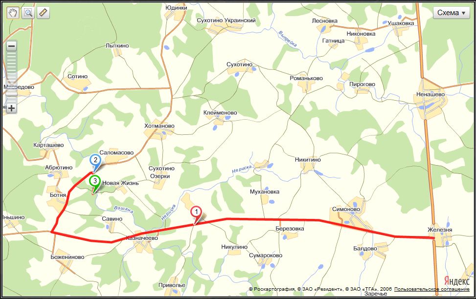 Updated: С М2, говорят, просто нужный поворот обозначен указателем на Алексин, без всяких Ненашево-Железня. На карте все видно хорошо.Доезд до лагеря: далее от места встречи по Р-143 до поворота на Ботню, там направо и до моста через реку Вашана (точка 2), перед мостом направо в поля и вдоль реки (дорога проезжая для жигулей) к лагерю (точка 3). От места встречи примерно 10 км.